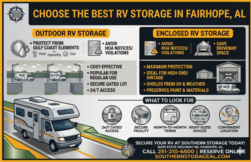 You’ve invested serious money in your RV. The last thing you want is to leave it sitting in a driveway, exposed to Gulf Coast heat, humidity, and storm season — or worse, getting a notice from your HOA. If you’ve been searching for outdoor RV storage in Fairhope, AL, Southern Storage on State Highway 181 has the secure, flexible solution Baldwin County RV owners have been counting on.